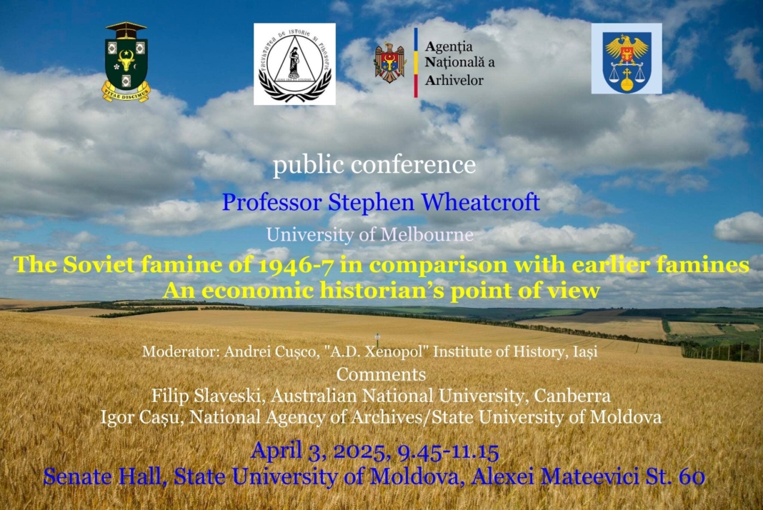 Agenția Națională a Arhivelor, parte componentă a Ministerului Justiției, împreună cu Universitatea de Stat din Moldova și Facultatea de Istorie și Filosofie, Universitatea de Stat din Moldova, organizează în data de 3 aprilie 2025, în Sala Senatului USM din strada Alexei Mateevici 60, între orele 9.45-11.15, conferința publică „Foametea sovietică din 1946-7 în comparație cu alte foamete anterioare: o perspectivă a istoriei economice”, care va fi susținută de Profesorul Stephen Wheatcroft, Universitatea din Melbourne, cea mai importantă autoritate mondială pe istoria economică a fenomenului foametei în URSS.