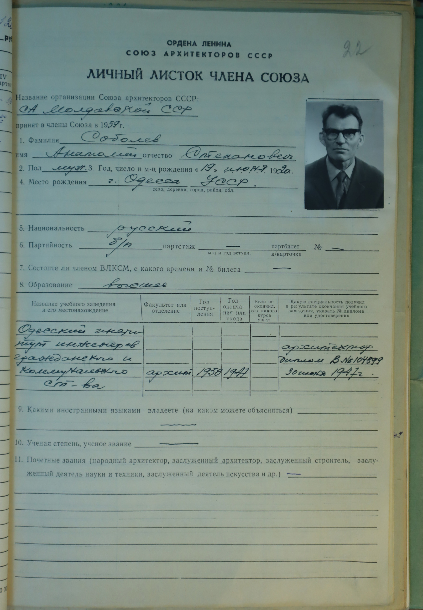 Născut la 19 iunie 1920 în or. Odesa, Anatoli Sobolenko şi-a făcut studiile la Institutul de Ingineri în Construcţii Locative şi Comunale din oraşul natal. După finalizarea studiilor superioare în anul 1947, a fost angajat în calitate de arhitect în cadrul Trustului de Proiectări „Moldstroiproekt” din capitala RSSM. Anatoli Sobolenko a proiectat construcţia unor complexe locative, Case ale Sovietelor, clădiri spitaliceşti şi sedii ale instituţiilor de învăţământ în oraşele Chişinău, Orhei, Bălţi, Soroca, Tighina, Râbniţa. Anatoli Sobolenko a fost primit în rândurile Uniunii Arhitecţilor din RSSM în anul 1959.